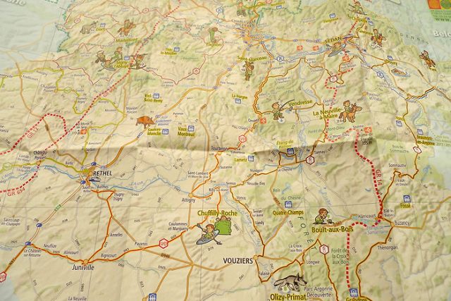 Je viens de recevoir la carte Sport et loisirs nature en Ardennes éditée par le Comité Départemental de Tourisme des Ardennes. C’est une carte très bien faite qui montre toutes les activités outdoor qu’on peut pratiquer dans les Ardennes : location de cycles, location de VTT, randonnée, rosalie, escalade, parcours aériens dans les arbres, parc acrobatique en hauteur, parapente, labyrinthe végétal, baignade, canoë, découverte nature, pêche, parc à loups, ski de fond, ânes de bât, activités équestres, golf, minigolf, parorama, il y en a pour tout le monde et pour tous les ages. Une très bonne initiative de la part de ce département.
