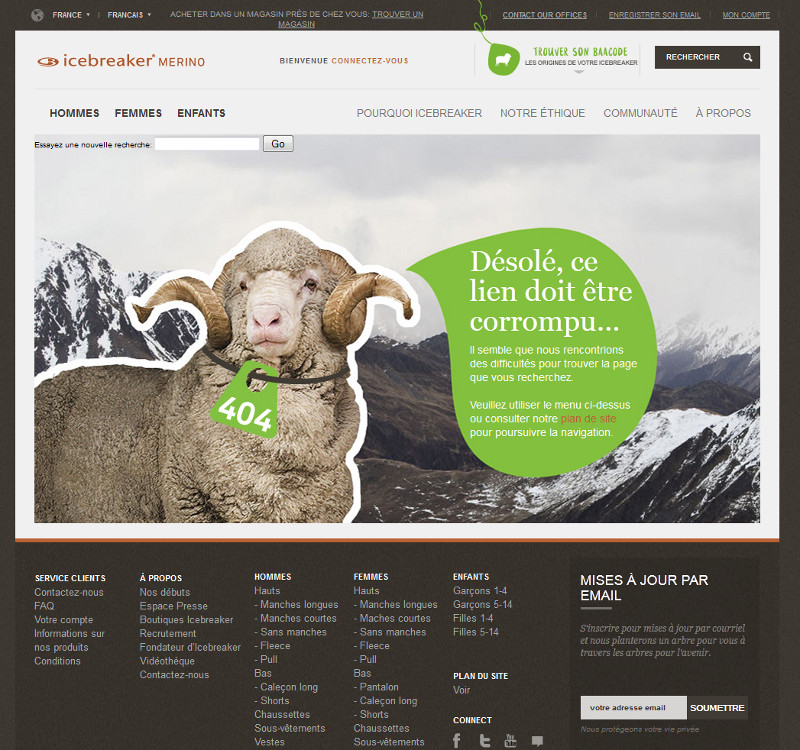 Icebreaker est une marque qui puise son inspiration dans la nature est essaye de proposer un ensemble de produits qui fonctionne sur le principe de la superposition des couches techniques. La marque travaille beaucoup avec de la laine mérinos et ça se voit sur leur site web qui est particulièrement réussi. De grandes images et des gros titres. De belles photos et juste ce qu’il faut de texte. C’est dommage que tout le site ne soit pas traduit en anglais notamment la partie qui concerne la marque. Le catalogue produit est très bien fait avec un classement par activité ou par type de vêtements. J’aime beaucoup.