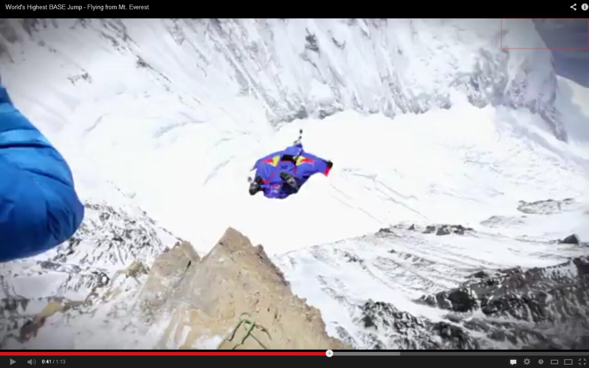 Cette année c’est le soixantième anniversaire de la première ascension de l’Everest, tout montagnard sait ça. Et bien, pour fêter ça, un alpiniste russe du nom de Valery Rozov a décidé de sauter depuis l’Everest en base-jump. Pour cela, il s’est entraîné pendant deux ans et il lui a fallu 4 jours pour arriver au sommet. Il a ensuite pu s’élancer pour un saut qui a du être grandiose. Quand il s’est élancé il n’était pas complètement au sommet puisque à priori il était à 7220 mètres d’altitude mais ça fait quand même un bon saut.
