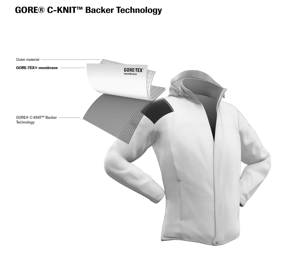 Après le Gore-Tex Active en 2011 et Gore-Tex Pro en 2013, voici la nouvelle membrane proposée par Gore-Tex. Il s’agit du Gore C-KNIT Backer qui permet d’obtenir des produits totalement imperméables et respirants tout en étant plus légers, plus respirants et plus doux que les produits précédents.