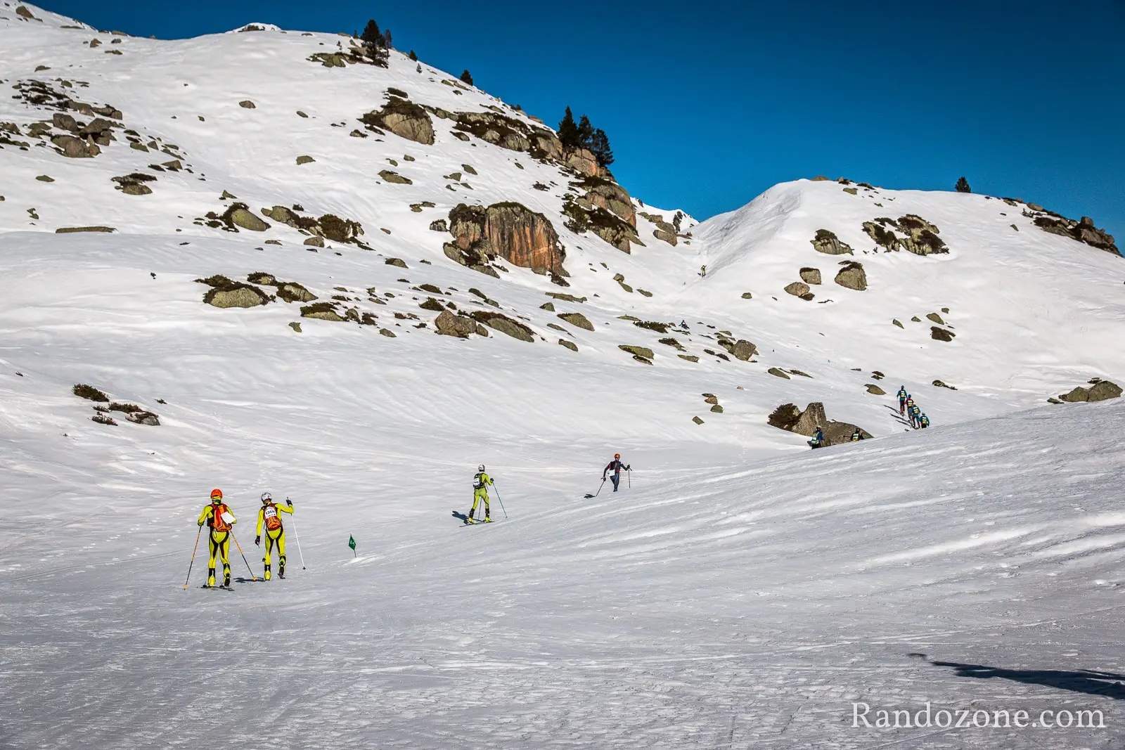 Le premier jour, je me suis posté à quelques centaines de mètres du départ au dessus du parking de Tournaboup sur la station de ski de Barèges/Tourmalet. Les participants allaient tous passer devant moi pour monter au lac Dets Coubous et ensuite faire une grande boucle pour revenir au même endroit. Après le passage des athlètes, j’ai profité de la durée de la boucle pour monter plus haut et me placer sur un point de passage à la descente. Un endroit très sympa qui fait un plateau et qui m’a permis de voir passer un bon nombre de skieurs à la descente.